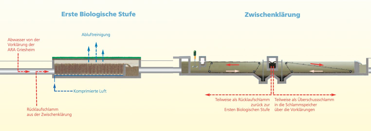 Der Prozess dieser Abwasserreinigung wird mit moderner Mess-, Steuer- und Regelungstechnik auf für die Bakterien optimale Lebensbedingungen eingestellt. Die prozessbedingt entstehende überschüssige Bakterienmasse (Überschussschlamm) lässt sich in der nachfolgenden Zwischenklärung entfernen und der Schlammbehandlung zuführen. In Sindlingen werden auch die Prozesswässer der SEVA (Zentrat, Kühl- und Waschwasser) in die Erste Biologische Stufe zur Behandlung eingeleitet, sowie, neben Kohlenstoff-, auch Stickstoffverbindungen (Nitrate) im biologischen Reinigungsprozess abgebaut (Denitrifikation).