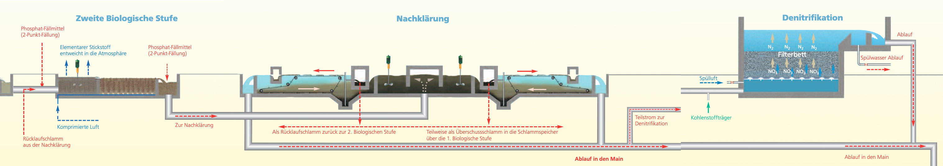 2. Stufe Biologische Reinigung, Nachklärung, Denitrifikation & Flockungsfiltration